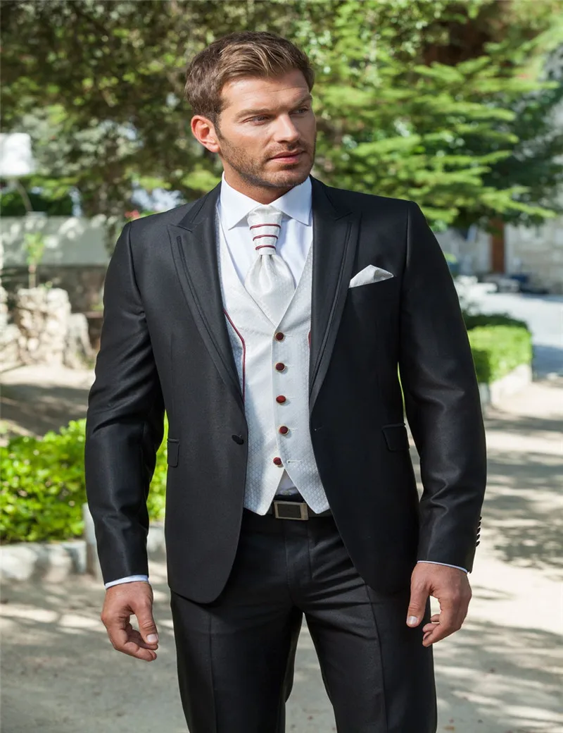 Special Offer Włoski Niestandardowe Made Szary Groom Garnitury Czarny Klapa Jeden Przycisk Kurtka + Spodnie + Krawat + Kamizelka Mężczyzna Smokingi Dla ślub Groomsmen Garnitury Discount 25% Today!