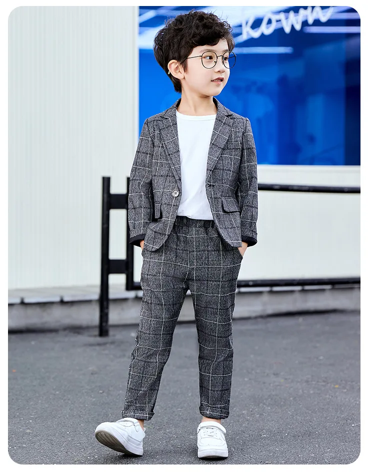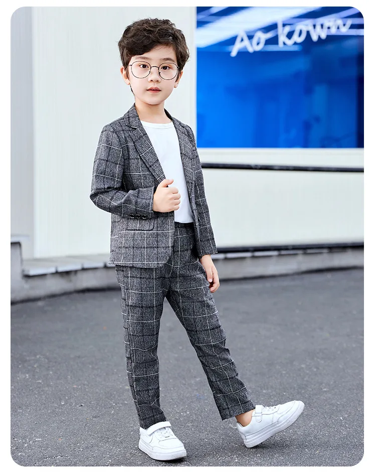 . (Zniżka 40%) Skup Tanie Szary Tweed Plaid Chłopcy Garnitury 2 Szt. Zestaw Letnia Jesień Dzieci Garnitur Weselny Marynarka Casual Oversize Dzieci Obiad Smoking Kurtka Spodnie Ceny.