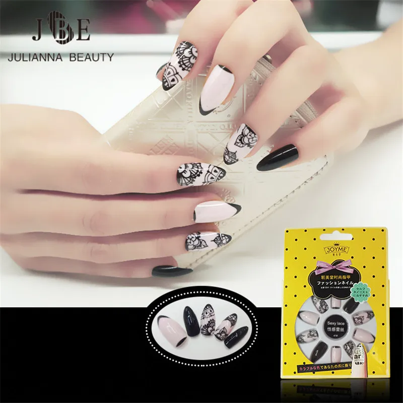 Special Offer Nowy 24 Sztuk/pudło Czarny Koronki Projekt Szpilki Fałszywe Paznokcie Z Bezpłatnym Gule Tipsy Akrylowe Porady UV Długie Sztuczne Sztuczne Paznokcie Faux Ongles Discount 25% Today!
